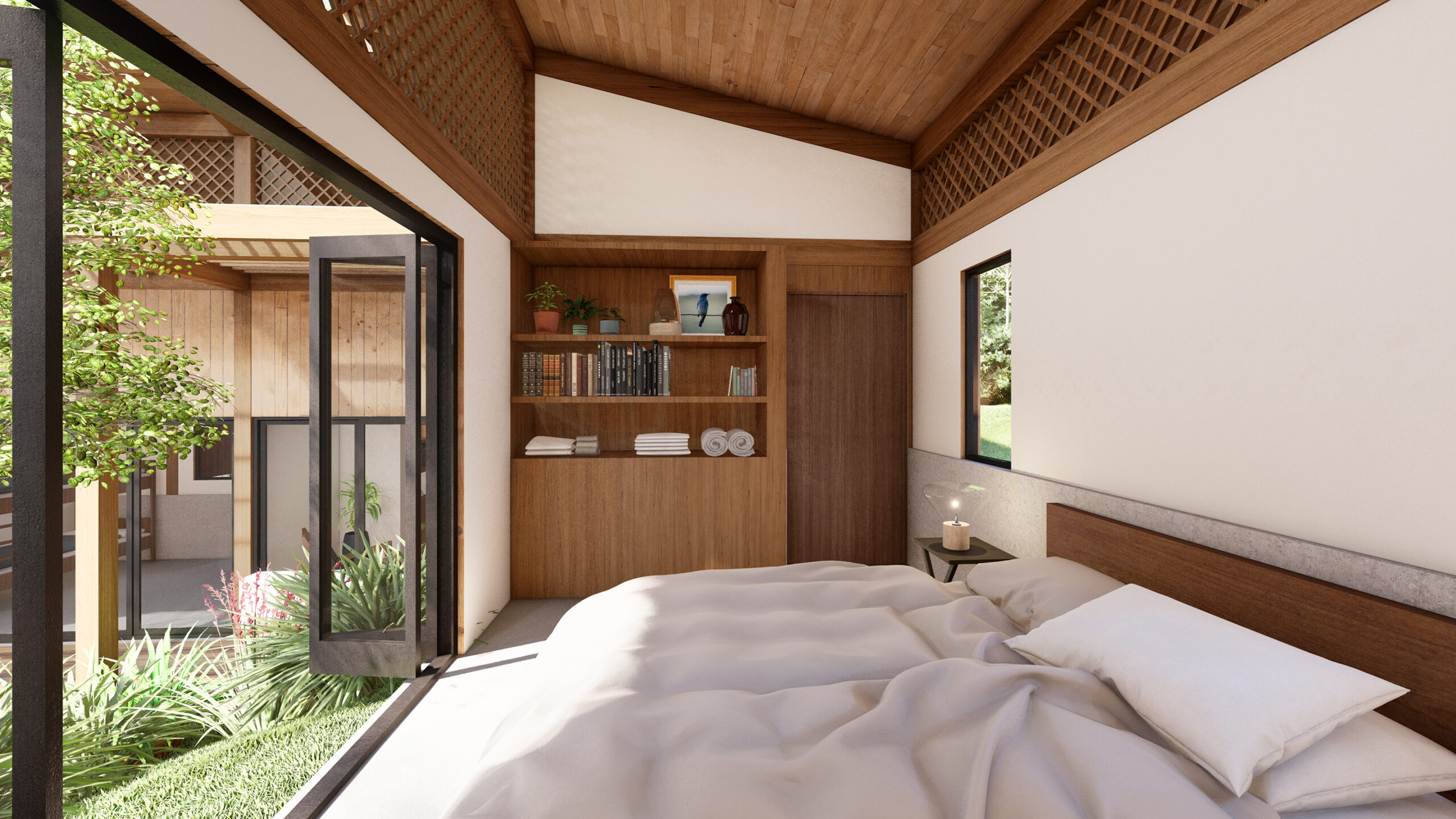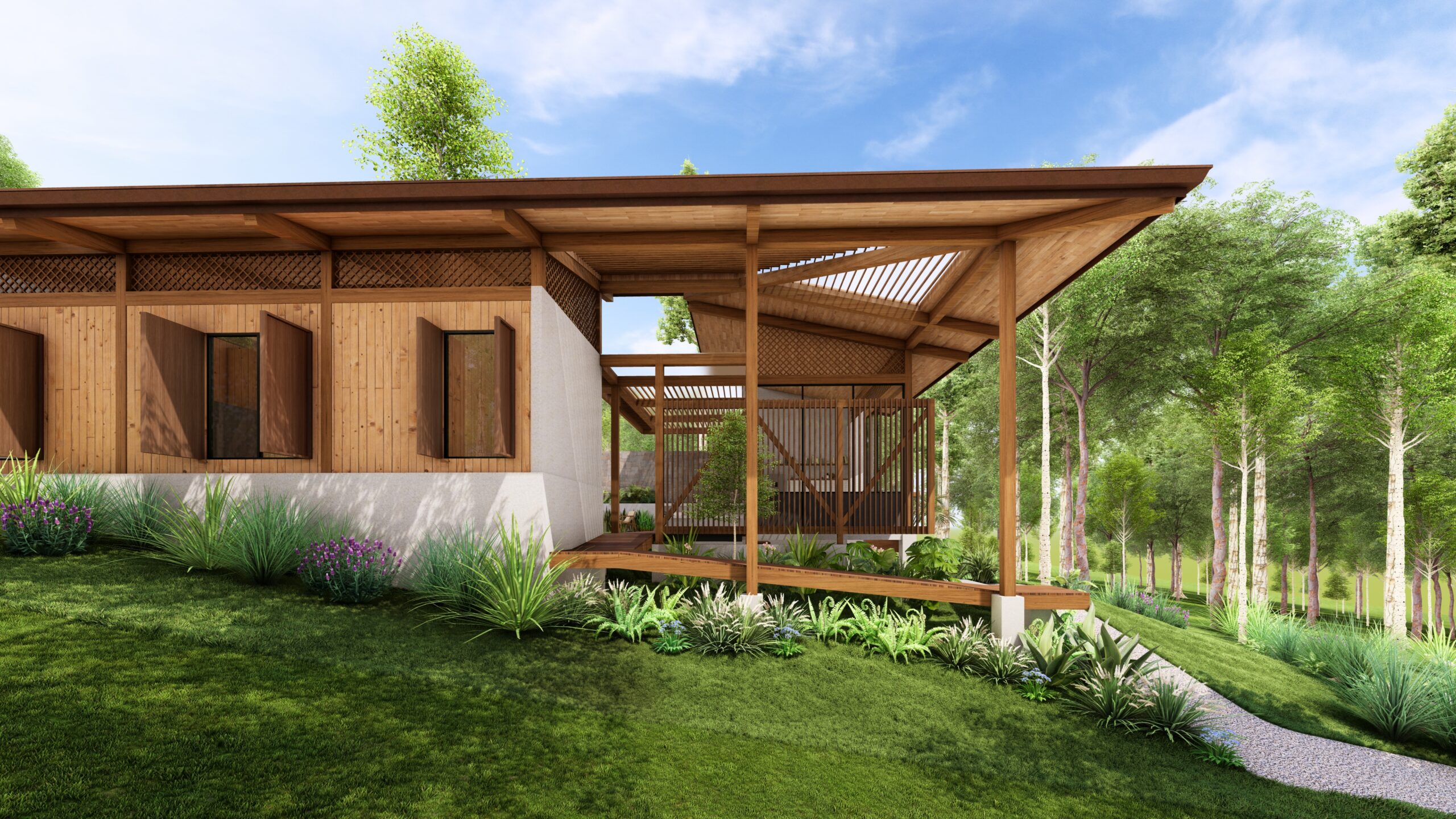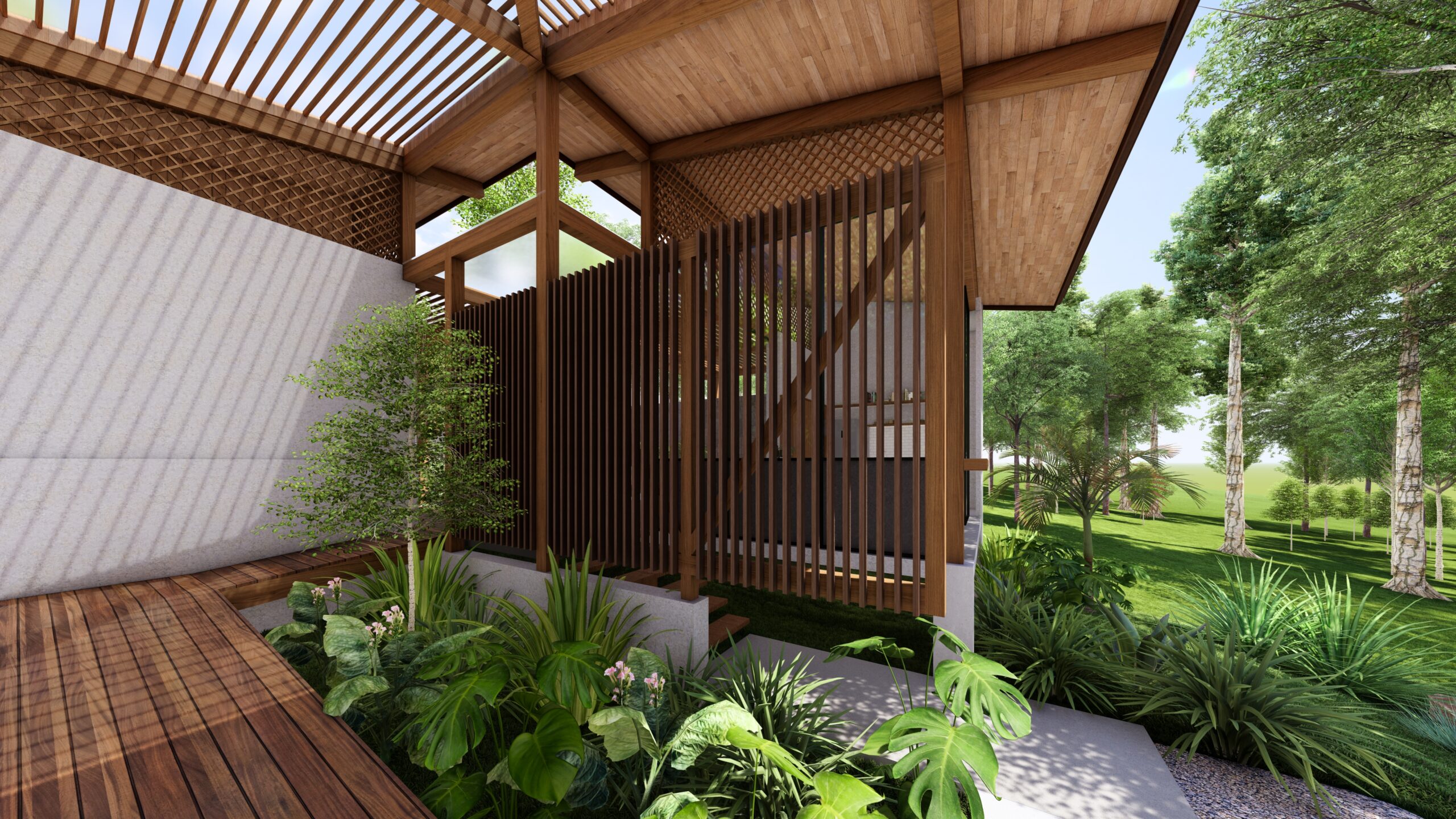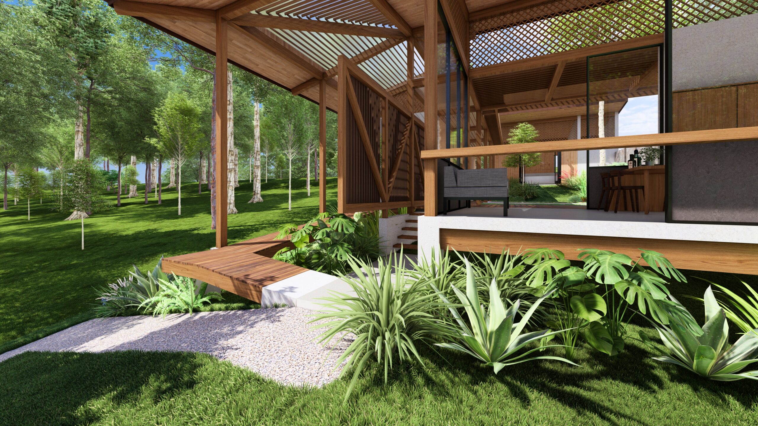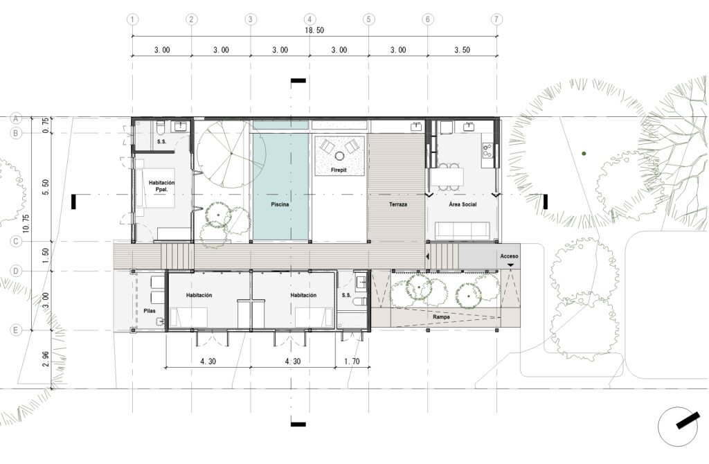 Through a co-creative process with our clients, the importance of shaping a spatial experience within a compact home was explored—one that articulates open terraces with comfortable, interconnected rooms. The project is conceived around family unity and shared time, with the ability to host relatives, friends, and close guests. A flexible social area and generous bedrooms are proposed to accommodate large groups. The social area is integrated with a swimming pool surrounded by gardens, BBQ areas, a fire pit, and resting spaces, focusing on the different ways of enjoying family togetherness.