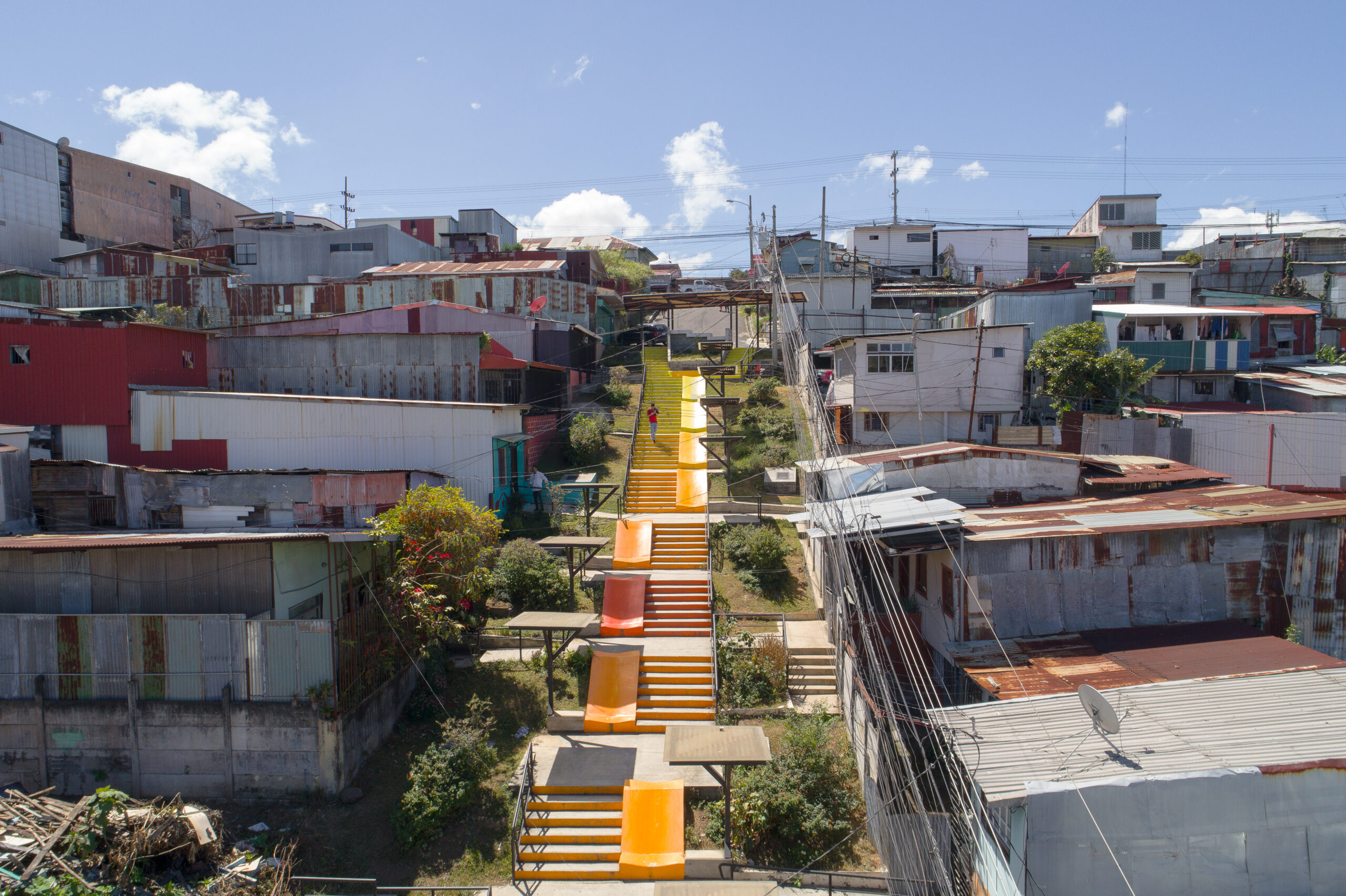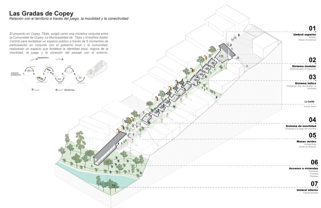 Las gradas de Copey, un proyecto impulsado por nuestrxs clientes, una comunidad que visualizaba un espacio común en contacto con el entorno inmediato y su historia, que permita acompañar sus múltiples actividades a la hora de recorrer este espacio público de manera segura entre las conexiones barriales por medio de escaleras públicas, toboganes, espacio verde, actividades lúdicas y estancias.